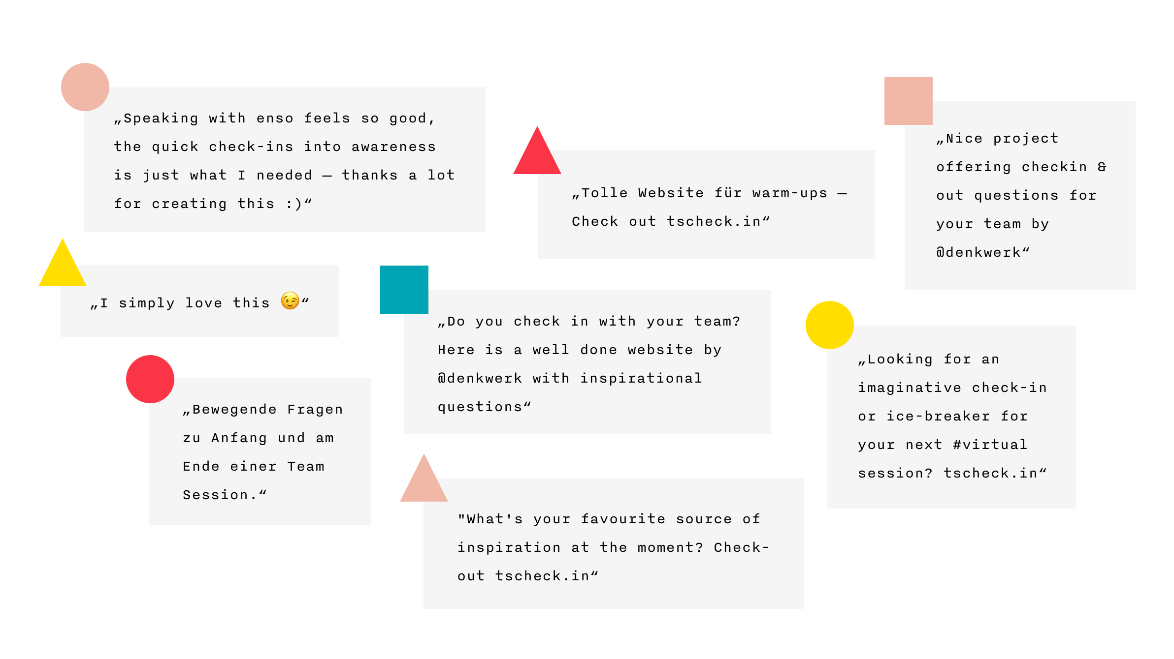 Neben enso haben wir auch unser „social undistancing“-Tool tscheck.in geteilt, das über das Web und auch direkt in Slack unsere gesammelten Fragen für Team Check-ins und Reflektionen verfügbar macht – und die vielleicht größte und inspirierendste Sammlung für diese Zwecke bietet. Die Wirksamkeit und Notwendigkeit des Rituals wird seit der verbreiteten Remote-Situation von jeder HR-, Coaching- oder Leadership-Instanz bestätigt und empfohlen. Wir können die wachsende Beliebtheit daran am eigenen Tool beobachten: